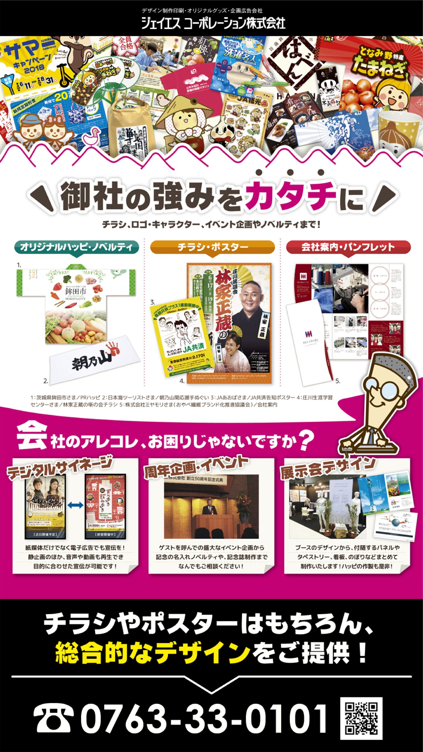 最近の制作実績 砺波市商工観光課様 キラキラミッション2025 ポスター・チラシ 砺波ロータリークラブ様 創立70周年記念誌 砺波地区小学生バレーボール連盟様 ウインターカップ大会冊子 厚生連高岡病院様 看護師募集ポスター 砺波市文化会館様 オリジナルミュージカル ダンシングダンス 仲八郎となみ野後援会様 仲八郎となみ野後援会千穐楽公演 チラシ・ポスター 制作実績一覧へ 新着情報 チラシ・ポスター以外の幅広い分野のデザインをご提案しています! date / 2026.01.15 新年あけましておめでとうございます。 date / 2026.01.06 年末年始休業のお知らせ date / 2025.12.12 HPをリニューアルいたしました! date / 2025.12.12 新着情報一覧へ