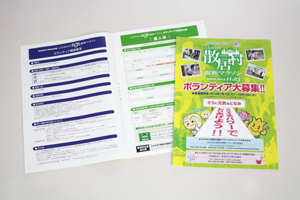 works 制作実績 グラフィックデザイン CIプランニング・オリジナルキャラ ノベルティ・オリジナルグッズ 展示会・イベント販促商品 Webデザイン メディア広告・宣伝 記念式典・イベント設営 制作実績となみ庄川散居村縦断マラソン A4チラシ2種 となみ庄川散居村縦断マラソン A4チラシ2種 client / となみ庄川散居村縦断マラソン実行委員会 となみ庄川散居村縦断マラソンのボランティア募集と、オリジナルTシャツ販売告知のA4チラシをそれぞれ制作させていただきました。