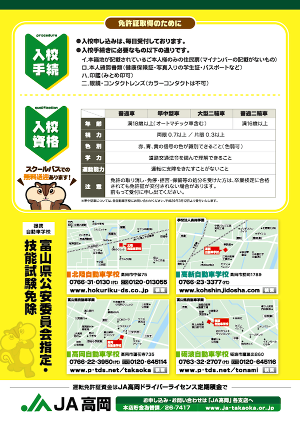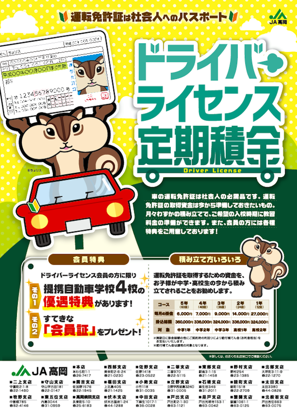works 制作実績 グラフィックデザイン CIプランニング・オリジナルキャラ ノベルティ・オリジナルグッズ 展示会・イベント販促商品 Webデザイン メディア広告・宣伝 記念式典・イベント設営 制作実績JA高岡 / ドライバーライセンス定期積金チラシ JA高岡 / ドライバーライセンス定期積金チラシ client / JA高岡