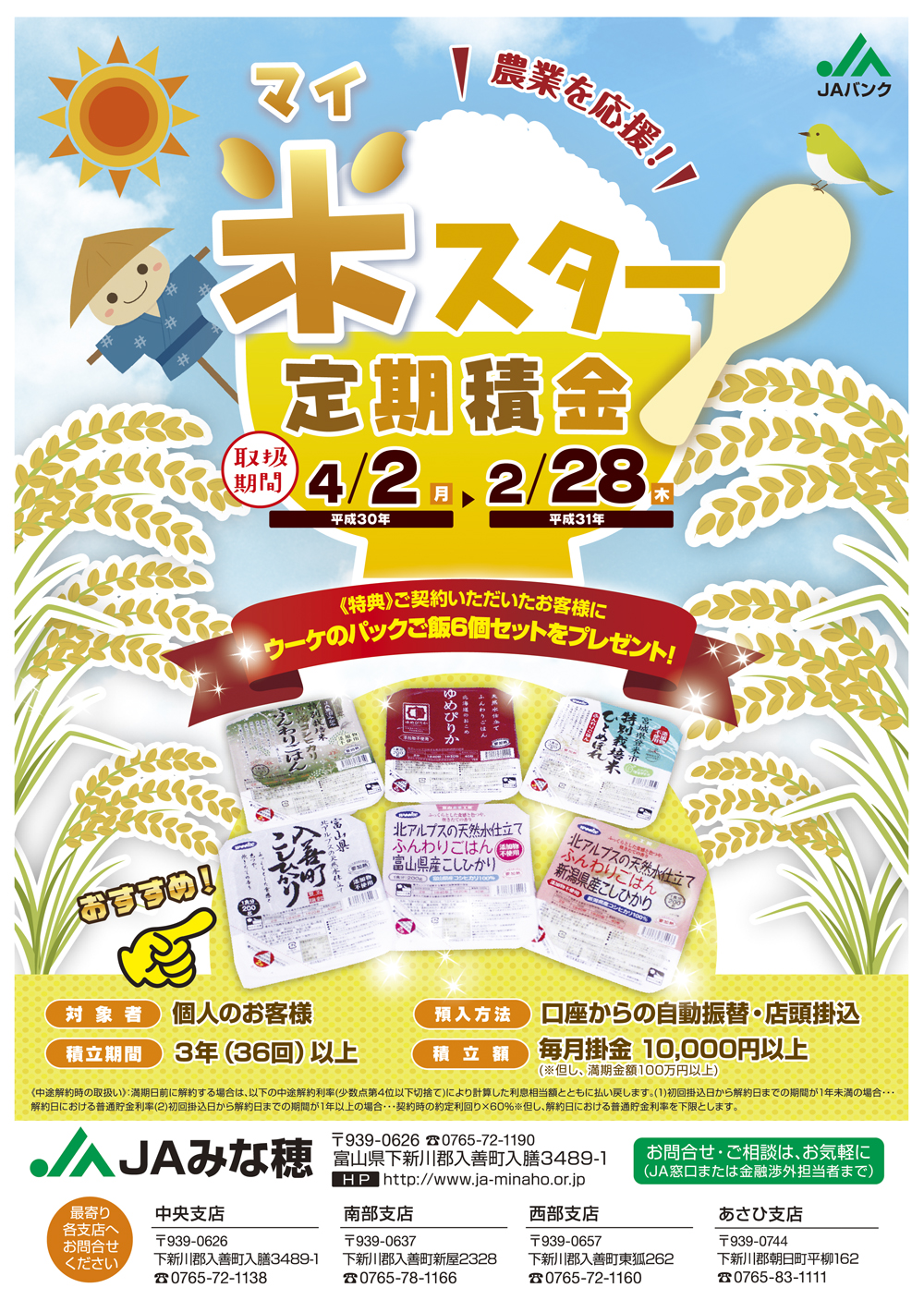 works 制作実績 グラフィックデザイン CIプランニング・オリジナルキャラ ノベルティ・オリジナルグッズ 展示会・イベント販促商品 Webデザイン メディア広告・宣伝 記念式典・イベント設営 制作実績JAみな穂 定期積金チラシ JAみな穂 定期積金チラシ client / JAみな穂