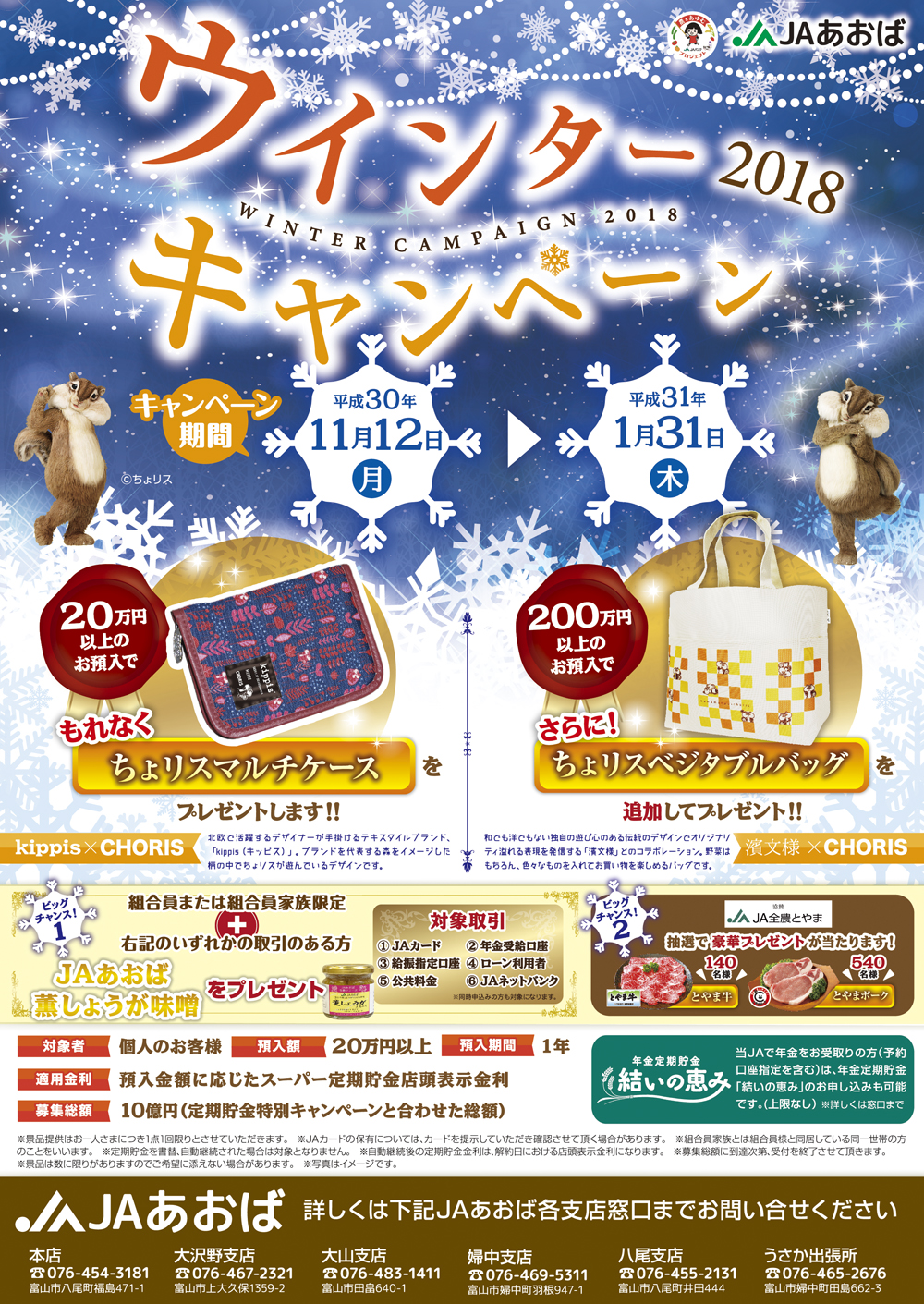 works 制作実績 グラフィックデザイン CIプランニング・オリジナルキャラ ノベルティ・オリジナルグッズ 展示会・イベント販促商品 Webデザイン メディア広告・宣伝 記念式典・イベント設営 制作実績JAあおば ウインターキャンペーン2018 チラシ JAあおば ウインターキャンペーン2018 チラシ client / JAあおば