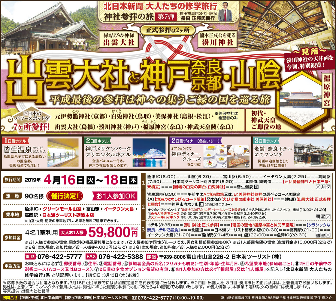 works 制作実績 グラフィックデザイン CIプランニング・オリジナルキャラ ノベルティ・オリジナルグッズ 展示会・イベント販促商品 Webデザイン メディア広告・宣伝 記念式典・イベント設営 制作実績北日本新聞掲載広告「大人たちの修学旅行」神社巡りツアー 北日本新聞掲載広告「大人たちの修学旅行」神社巡りツアー client / 北日本新聞・日本海ツーリスト date / 2019年4月1日