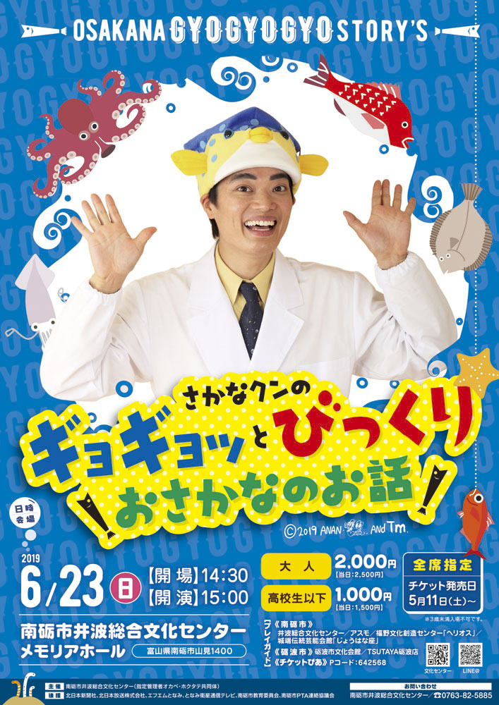 works 制作実績 グラフィックデザイン CIプランニング・オリジナルキャラ ノベルティ・オリジナルグッズ 展示会・イベント販促商品 Webデザイン メディア広告・宣伝 記念式典・イベント設営 制作実績南砺市井波総合文化センター / 「さかなクンのギョギョッとびっくりおさかなのお話」広告チラシ 南砺市井波総合文化センター / 「さかなクンのギョギョッとびっくりおさかなのお話」広告チラシ client / 南砺市井波総合文化センター