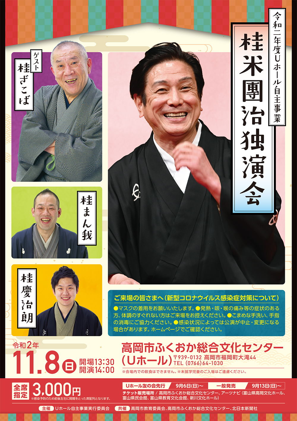 works 制作実績 グラフィックデザイン CIプランニング・オリジナルキャラ ノベルティ・オリジナルグッズ 展示会・イベント販促商品 Webデザイン メディア広告・宣伝 記念式典・イベント設営 制作実績ふくおか総合文化センター様 / 桂米團治独演会チラシ・ポスター ふくおか総合文化センター様 / 桂米團治独演会チラシ・ポスター client / ふくおか総合文化センター