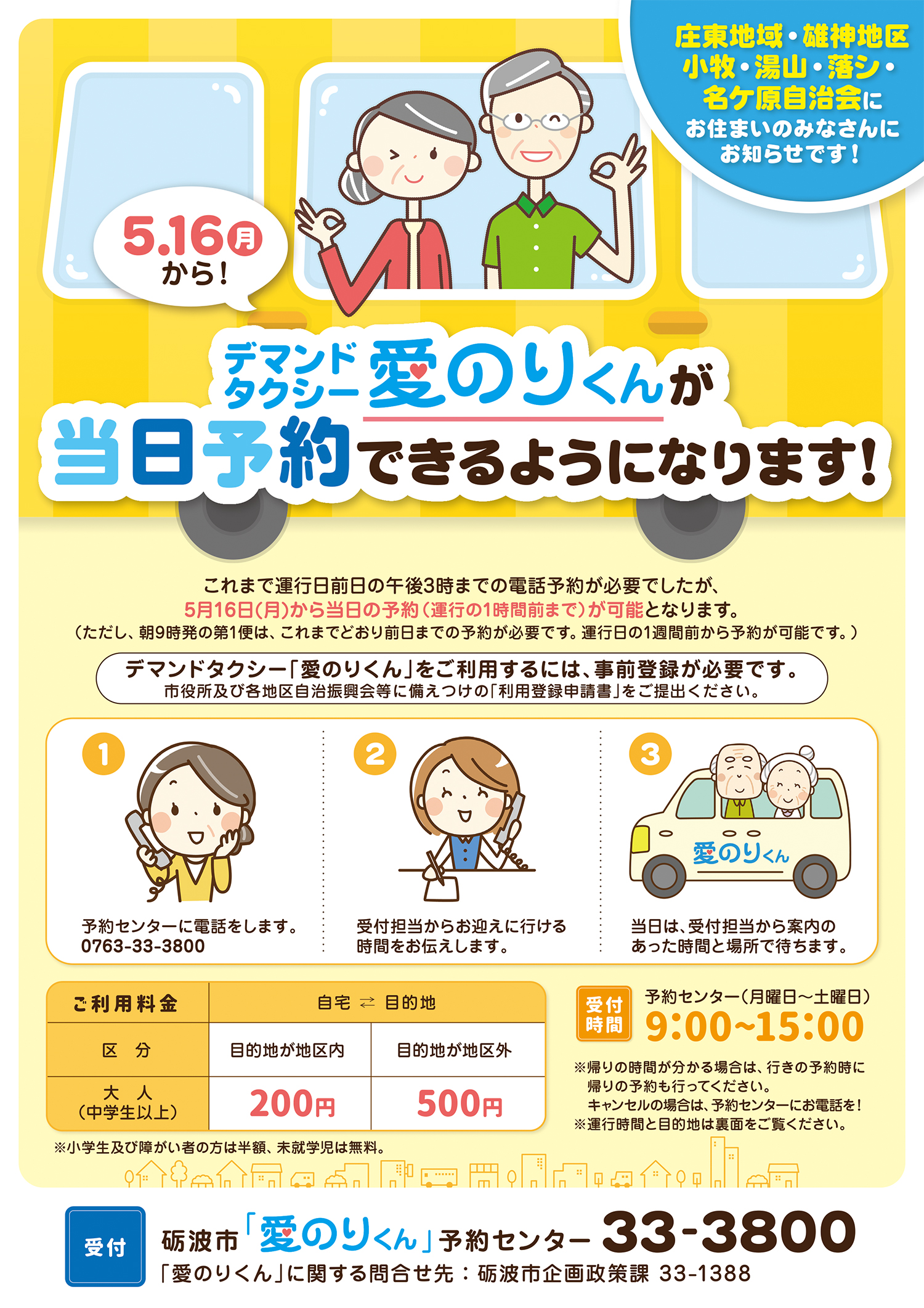works 制作実績 グラフィックデザイン CIプランニング・オリジナルキャラ ノベルティ・オリジナルグッズ 展示会・イベント販促商品 Webデザイン メディア広告・宣伝 記念式典・イベント設営 制作実績砺波市企画政策課様/ デマンドタクシー「愛のりくん」チラシ 砺波市企画政策課様/ デマンドタクシー「愛のりくん」チラシ client / 砺波市企画政策課