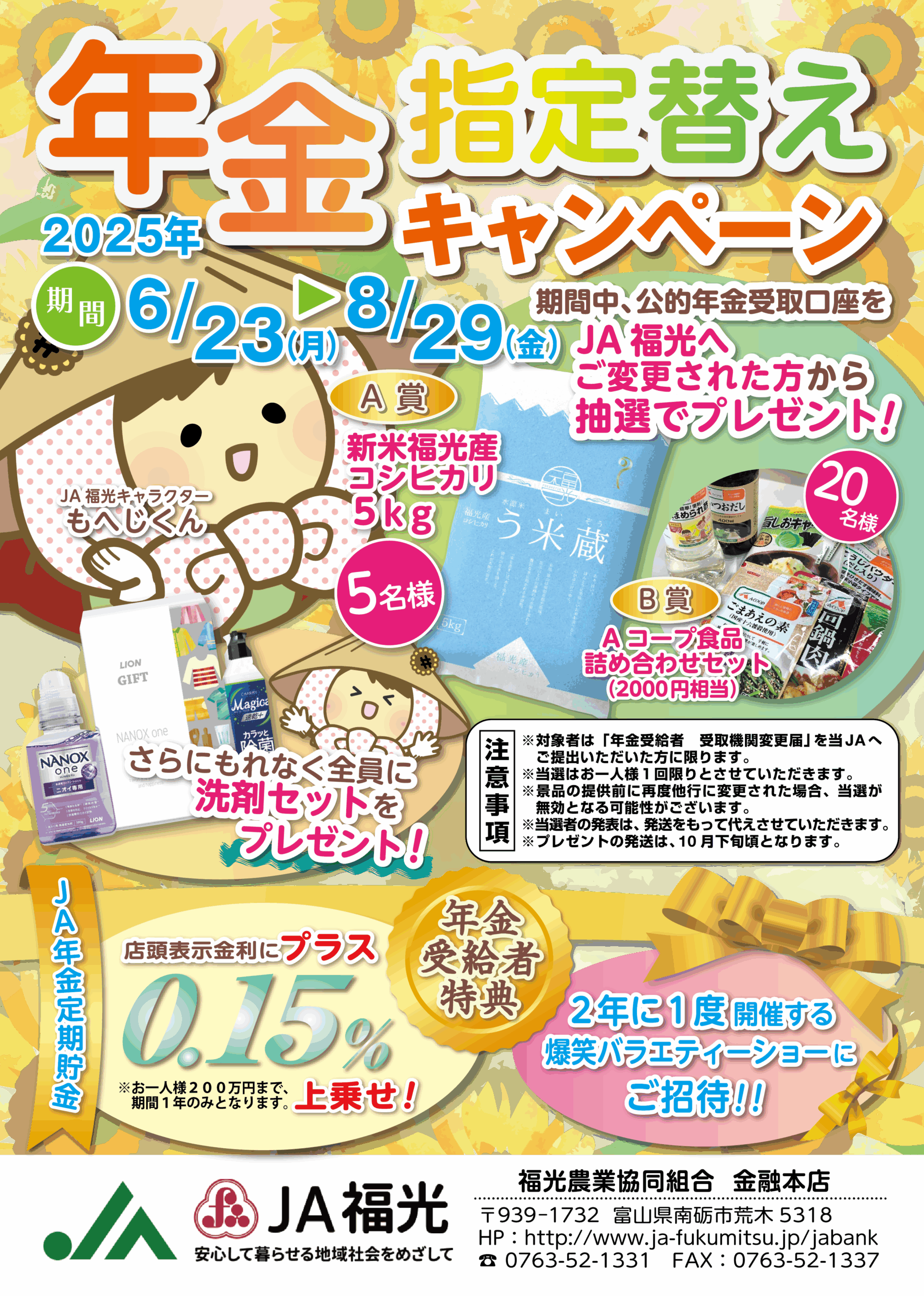 works 制作実績 グラフィックデザイン CIプランニング・オリジナルキャラ ノベルティ・オリジナルグッズ 展示会・イベント販促商品 Webデザイン メディア広告・宣伝 記念式典・イベント設営 制作実績福光農業協同組合様 年金指定替えキャンペーンチラシ 福光農業協同組合様 年金指定替えキャンペーンチラシ client /