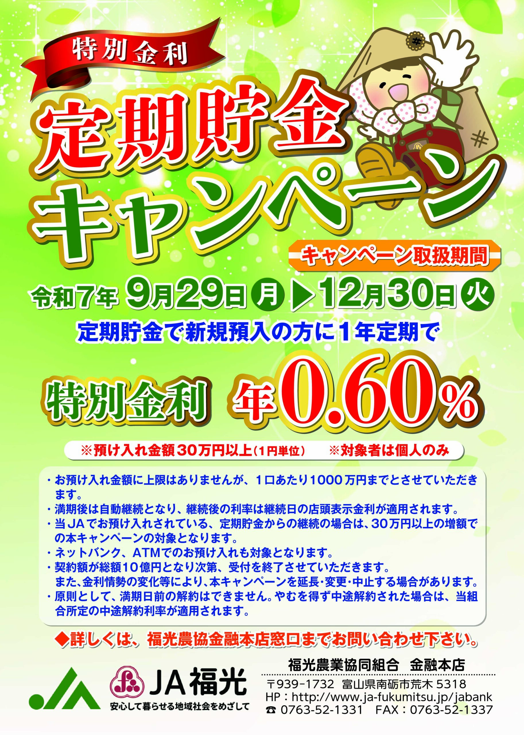 works 制作実績 グラフィックデザイン CIプランニング・オリジナルキャラ ノベルティ・オリジナルグッズ 展示会・イベント販促商品 Webデザイン メディア広告・宣伝 記念式典・イベント設営 制作実績福光農業協同組合 金融課様 定期貯金キャンペーンチラシ 福光農業協同組合 金融課様 定期貯金キャンペーンチラシ client /