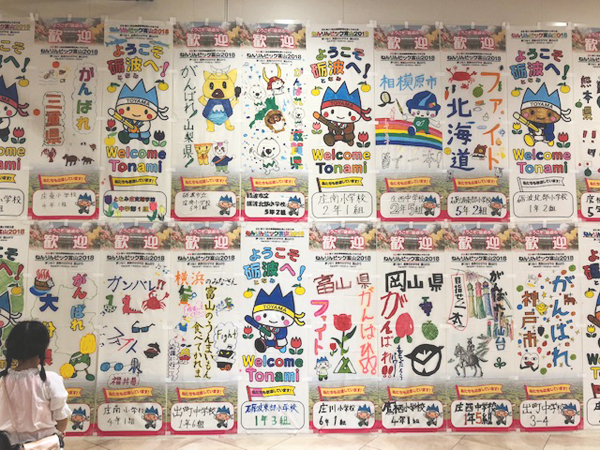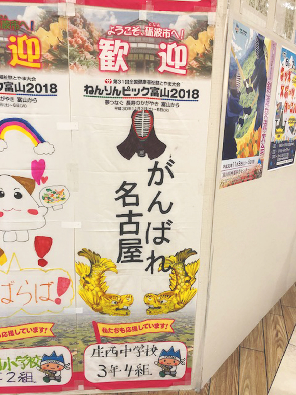 県外からいらっしゃる方へ向けての応援ののぼりで、先駆けに10月頭からイオンモール砺波店にみなさんの絵がかれたのぼりが張り出してありました。
